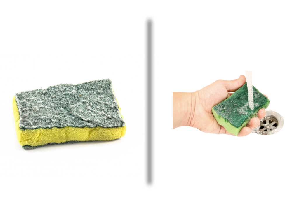 カラカラに乾いて「カチカチになったスポンジ」と水を含んだ「ふわふわのスポンジ」。